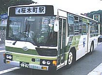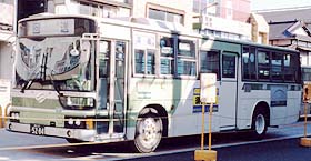 ワンステップのロマンス車です。他の車両と区別するため、外部塗装もライトグリーンの縁に赤色の極細帯が巻かれています。車内には、背もたれが高いハイバックシートが配置され、前の方まで2人掛けとなっています。座席を多く配置するため、中扉は引き戸となりました。エアサス(空気バネ)が採用されています。