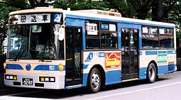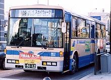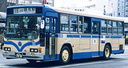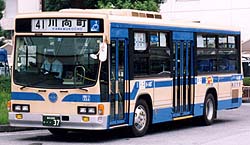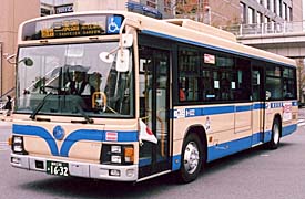 富士重7E車体を架装した長尺のQ尺車(軸間5.8m)です。109系統の運用を前提として、運転室直後から後まで2人掛けのハイバックシートが整然と並んでいます。エアサス(空気バネ)が採用され、乗降時に車体を下げられるニーリング機能(車高調整装置)を備えています。扁平タイヤを履いた都市型低床車で、屋根上には換気扇2つ以外は何ものっていないという、さっぱりした外見です。運用はやはり109系統がほとんどで、休日には観光客を、平日にはたくさんの通勤客を乗せて走ります。桜木町駅付近で撮影