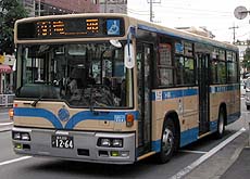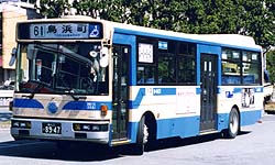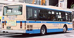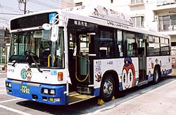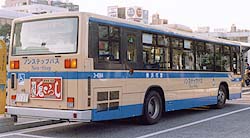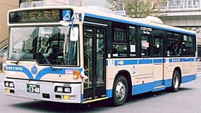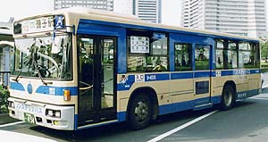 滝頭営業所には、引き続きCNG車が投入されましたが、富士重工業がバス製造から撤退したことから、西工96MCボディとなりました。外部塗色は引き続き白いものが採用されていますが、富士重工業製と比較するとかなり趣が異なります。幸いボディ全体の全面広告ラッピングは行われず、「はまりん」の絵が付いています。最近の転属で浅間町に移り、53系統でも使用されています。