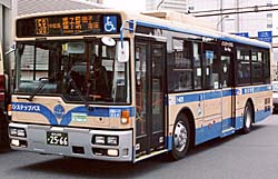 超低床スロープ付きバスとして登場したワンステップバスです。この年式は、磯子営業所に登場した車両のみ西工車体が採用され、フロントガラスと行き先表示が独立した西工顔を横浜市営に始めて持ち込みました。フロントガラスは左右対称のB-Iボディが採用されています。中型車の車体幅に大型車並の全長で、エンジンは中型車ベースのものを使用しています。側窓の黒色サッシ上段引き違い・下部固定窓と外部新塗装の採用は富士重車体の車両と同じです。晩年は転属によって浅間町・滝頭にも当グループが在籍しました。